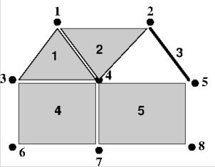 element knooppunten ------- ----------- 1 1 3 4 2 1 2 4 3 2 5 4 3 4 6 7 5 4 5 7 8De tweede lijst verbindt ieder knooppunt met de elementen die eraan vastzitten, dat is de duale samenhang: