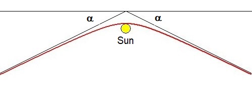 Gravitational deflection of light is the second classical test on General Relativity. Quote mining is from Newtonian gravitational deflection of light revisited as well: $$ \delta \phi_{E} = \frac{4GM_S}{c^2R_S} \SP \delta \phi_{N} = \frac{2GM_S}{c^2R_S} $$ Here $\,\delta \phi$ are the deflection angles, according to Einstein and Newton respectively. $G$ is the Gravitational constant, $M_S$ is the mass of our sun, $R_S$ is the radius of our sun $= 696,340\;km\,$, $c$ is the speed of light $= 299,792,458\;m/s\,$. The outcome with General Relativity is commonly thought to be twice the outcome with Newton Gravity. However, I have found some "Accurate Solution to the Gravitational Bending of Starlight by a Massive Object", showing that $\delta_{NG}$ would be exactly the same as $\delta_{GR}$ ! One reason for the twist seems to be that the kinetic energy of a photon, according to Special Relativity, is $\,mc^2\,$ instead of $\,\half mc^2\,$ as assumed in Newtonian mechanics. If the document holds water, then General Relativity is doomed to become redundant, at least insofar Light Bending is concerned. I find this difficult to believe, though. Let us divide potential energy by kinetic energy in both cases, then the Einstein solution comes out the wrong way: $$ \delta \phi_{E} = \frac{GM_Sm/R_S}{mc^2} = \frac{GM_S}{c^2R_S} \SP \delta \phi_{N} = \frac{GM_Sm/R_S}{\half mc^2} = \frac{2GM_S}{c^2R_S} $$ I have decided to recapitulate the Newtonian version of the bending, in order to be completely certain. Let's start with some mathematics: Equations of Hyperbolas.