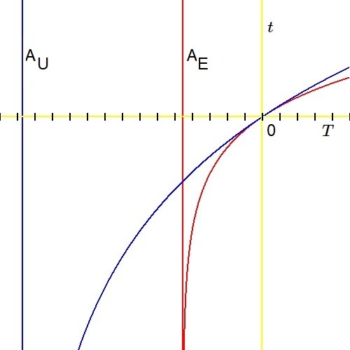 Ready for some good news? Let us compare an electron created at the supposed Big Bang $(A_U)$ with an electron having the age of the earth $(A_E)$; both are in orbital time. The graph of Milne's Formula corresponding with $A_U$ is colored blue and the graph of Milne's Formula corresponding with $A_E$ is colored red. The two asymptotes at $\,\color{blue}{T=-A_U}\,$ and $\,\color{red}{T=-A_E}\,$ are displayed as well. The black ticks at the $T$-axis are each a billion years apart. According to the above we have: $$ \delta \lt \frac{1}{2}\frac{T}{A_1A_2}(A_2-A_1) \hieruit T \gt \frac{2A_UA_E\,\delta}{A_U-A_E} $$ That's enough information again for a decent calculation (with MAPLE 8).