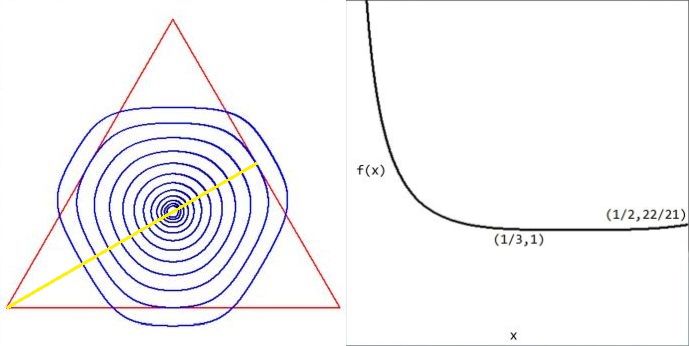 Let's specify $f(a,b,c)$ for $y=x\;$ i.e. $\;a=3(1-2x) , b=3x , c=3x$ . This is the yellow line in the contour plot on the left. Then we have: $$ f(x) := f(3(1-2x),3x,3x) = \frac{4}{3(1-x)(4-9x+18x^2)}+\frac{1}{3x(4-9x^2)} $$ The graph of this function is seen on the right. As expected, there is a positive singularity at $x=0$ . Then the function decreases uniformly until it reaches its minimum $f(1/3)=1$ at the center of the triangle. After that it raises a little bit until that local maximum $f(1/2)=22/21$ in the middle of an edge. That $f(1/3)=1$ is indeed a minimum can be verified by calculating $f'(1/3) = 0$ .