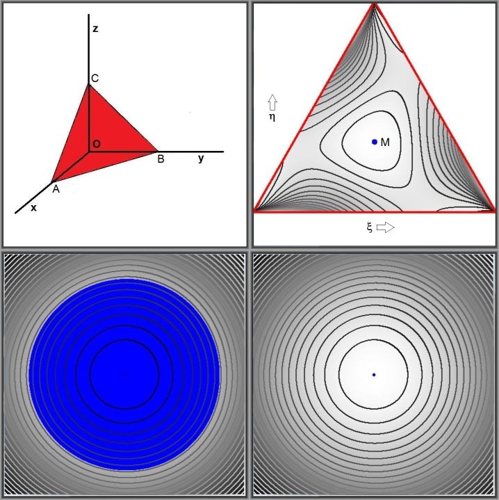 A local and planar orthogonal coordinate system for the equilateral triangle can be obtained as: $$ \vec{e}_\xi = \vec{OB}-\vec{OA} = \left[ \begin{array}{c} -1 \\ +1 \\ 0 \end{array} \right] / \sqrt{2}\\ \vec{e}_\eta = \vec{OC}-\left(\vec{OA}+\vec{OB}\right)/2 = \left[ \begin{array}{c} -1/2 \\ -1/2 \\ +1 \end{array} \right] / \sqrt{3/2} $$ Giving for the relationship between global coordinates $(x,y,z)$ and local triangle coordinates $(\xi,\eta)$: $$ x = -\frac{1}{\sqrt{2}} \xi -\frac{1}{\sqrt{6}} \eta + \frac{1}{3}\\ y = +\frac{1}{\sqrt{2}} \xi -\frac{1}{\sqrt{6}} \eta + \frac{1}{3}\\ z = \sqrt{\frac{2}{3}} \eta + \frac{1}{3} $$ It's easily verified that $x+y+z=1$ ; the origin of the local coordinate system is at $(\xi,\eta) = (0,0)$ . In this way, the function can be expressed in local triangle coordinates, but (at least for me) that didn't simplify the puzzle much.