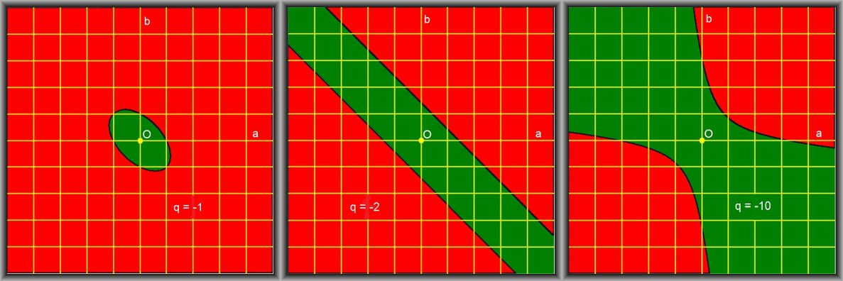 The equation can be rewritten as: $$ F(a,b) = a^2+b^2 - q(ab-1) = 0 $$ If we now interpret $\,(a,b)\,$ as real valued coordinates, then pictures can be made for the curve $\,F(a,b) = 0$ . Where $\color{green}{green}$ means $\,F(a,b)<0\,$ and $\color{red}{red}$ means $\,F(a,b)>0\,$ . Two cases are distinguished: $\,q > 0\,$ and $\,q < 0$ ; nowhere it has been said that the integers are positive.
