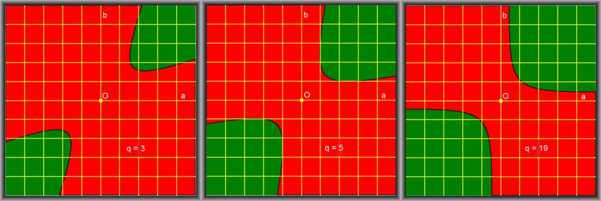 Pictures of $\,F(a,b)=0\,$ for the case $\,q > 0$ , to be precise $\,q=3$ , $q=5$ , $q=19$ :