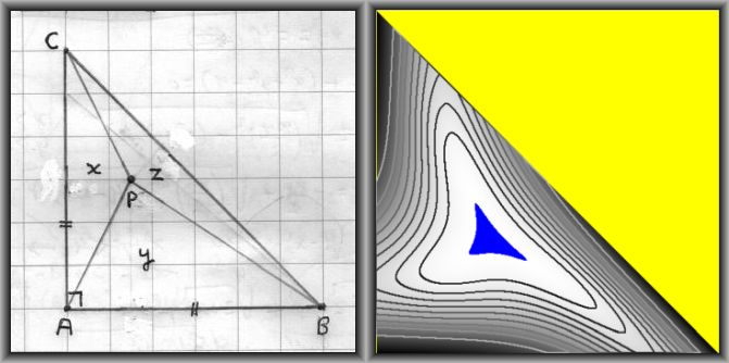 So-called area coordinates $(x,y,z)$ in the (rectangular & isosceles) triangle are defined as follows: $$ x/3 = \frac{\Delta APC}{\Delta ABC} \quad ; \quad y/3 = \frac{\Delta BPA}{\Delta ABC} \quad ; \quad z/3 = \frac{\Delta CPB}{\Delta ABC} $$ The $x$ and $y$ area-coordinates conform to the common Cartesian coordinates in this case, but the $z$ coordinate is different.