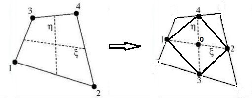 other vertices. The global and local coordinates of an arbitrary quadrilateral are related to each other via: