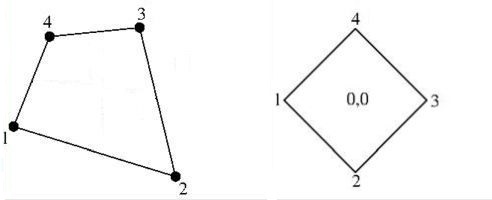 But now we have a little problem. Consider the quadrilateral as depicted in the above picture on the right. The vertex-coordinates of this quadrilateral are defined by the second and the third column of the matrix below. This matrix is formed by specifying $T$ vertically for the nodal points and horizontally for the basic functions $ 1,x,y,xy $ : $$ \begin{bmatrix} T_1 \\ T_2 \\ T_3 \\ T_4 \end{bmatrix} = \begin{bmatrix} 1 & -\frac{1}{2} & 0 & 0 \\ 1 & 0 & -\frac{1}{2} & 0 \\ 1 & +\frac{1}{2} & 0 & 0 \\ 1 & 0 & +\frac{1}{2} & 0 \end{bmatrix} \begin{bmatrix} A \\ B \\ C \\ D \end{bmatrix} $$ The last column of the matrix is zero. Hence it is singular, meaning that $A,B,C$ and $D$ cannot be found in this manner. Though with a unstructured grid there may seem to be not a great chance that a quadrilateral is exactly positioned like this, experience reveals that it cannot be excluded that Murphy comes by. That alone is enough reason to declare the method for triangles not done for quadrilaterals.