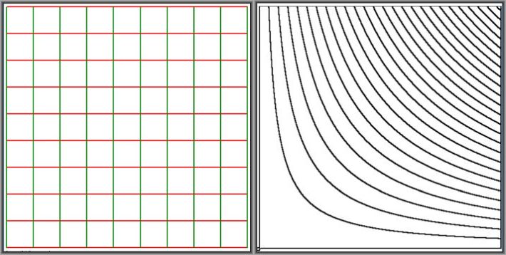 There is still another issue with the streamline (= streamfunction isoline) plot, as shown in the above picture on the right. Solving for the parameters of a Quadrilateral Interpolation, as would be needed with the algorithm for defining an isoline plot, is virtually impossible with quadrilaterals that are not paralellograms. Therefore we have subdivided each of our quads into four triangles. Thanks to an algorithm by Paul Bourke, defining isolines with triangles is a matter of routine.