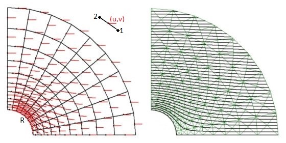 Assembly. In the first answer, $M \times N$ overdetermined equations $A$ are defined first, where in our case $M = 180$ and $N = 100$. While forming the system matrix $S=A^TA$ we thus have $180\times 100^2$ operations, which is ridiculous because $A$ is almost empty: only $2$ of the $100$ entries in a row are non-zero! It's easy to improve this by defining $A$ as being an $1 \times 2$ array and forming $A^TA$ as an elementary matrix $E$, corresponding with just one equation; $r$ is the right hand side of it. $$ E = A^TA = \begin{bmatrix} -1 \\ +1 \end{bmatrix} \begin{bmatrix} -1 & +1 \end{bmatrix} = \begin{bmatrix} +1 & -1 \\ -1 & +1 \end{bmatrix} \\ r = \begin{bmatrix} -1 \\ +1 \end{bmatrix}\left[-v_{12}(x_2-x_1) + u_{12}(y_2-y_1)\right] $$ The elementary matrices $E$ and loads $r$ must subsequently be assembled into the system matrix $S$ and global load vector $b$. Which happens to be exactly the same procedure as is common with the conventional finite element method. The name Least Squares Finite Element Method is justified herewith.