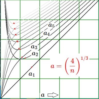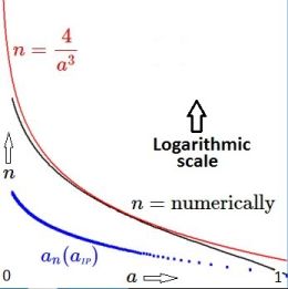 \> a_1 := a; a_2 := a+1/a_1; a_3 := a+2/a_2; a_4 := a+3/a_3; a_5 := a+4/a_4;Though I find it not very enlightning, in this case an exact solution can be found as well: $$ a_{4,5} = \sqrt{\left(8+6\sqrt{2}\right)^{1/3}-\frac{2}{\left(8+6\sqrt{2}\right)^{1/3}}-1}; $$ Continuing in this way (with some higher precision) gives the following results, before MAPLE and my own Newton-Raphson iterations give up. $$ \begin{matrix} {\bf \mbox{IP abscisssa} \; a} & {\bf n} & {\bf < 4/a^3} \\ 1 & 2,3 & 4 \\ 0.871337913570159 & 4,5 & 6.04644570004055 \\ 0.792253607266638 & 6,7 & 8.04391208677473 \\ 0.736268951824715 & 8,9 & 10.0219107501819 \\ 0.693502616556087 & 10,11 & 11.9926643644897 \\ 0.659225892899425 & 12,13 & 13.9623081896349 \\ 0.630825547822963 & 14,15 & 15.9342699607407 \\ 0.606713039185383 & 16,17 & 17.9105946558336 \end{matrix} $$ Herewith the conjecture is proved , for $\;n=1,2,3,4,5,6,7,8,9,10,11,12,13,14,15,16,17$ .