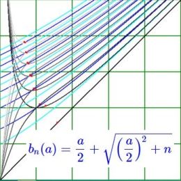 We expect that $b_n(a) = a_n(a) = a_{n+1}(a)$ at the intersection points. However, there is a difference between the curves in dark Blue and light blue (Aqua). The former are for $b_n(a)$ with $n = $ even; they intersect $a_n(a)$ and $a_{n+1}(a)$ as expected. The latter are for $b_n(a)$ with $n = $ odd; they do not intersect $a_n(a)$ and $a_{n+1}(a)$. But all blue curves $b_n(a)$ are somehow interesting, because they are asymptotes to the curves $a_n(a)$. For large values of $a$ we have almost straight lines: $$ b_n(a) = \frac{a}{2}+\frac{a}{2}\sqrt{1+\frac{n}{(a/2)^2}} \approx a + \frac{n}{a} $$ Still another way to calculate the intersection points is to determine the minimum of the curves $a_n(a)$ for $n = $ even. Which is easy to prove, because $a_n(a)\ne a/2$ in : $$ a_n^2(a)-a\cdot a_n(a)-n = 0 \quad \Longrightarrow \quad a_n'(a)\left[2 a_n(a)-a\right]= 0 \quad \Longrightarrow \quad a_n'(a)=0 $$ The slope of the accompanying odd curve at such a minimum is always $1$ , according to: $$ a_{n+1}'(a) = \left(a-\frac{n}{a_n(a)}\right)' = 1-\frac{n\, a_n'(a)}{a_n^2(a)} = 1 $$ Let's do some work with help of MAPLE:
