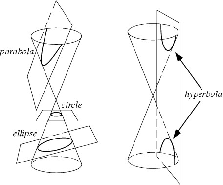 &\mbox{Hyperbola}& \quad \Longleftrightarrow \quad \epsilon > 1 \quad \Longleftrightarrow \quad (B^2 - 4 A C) > 0