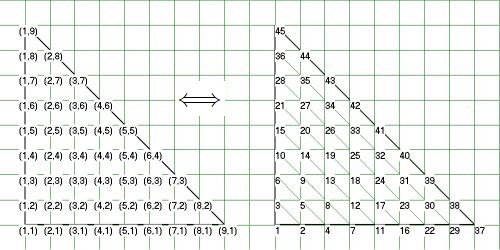What I need first is a formula or a short algorithm (preferrably a one-liner) that converts Grid coordinates into Triangle numbering.
