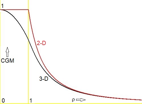 If we make a graph of the two functions - red for 2-D, black for 3-D - then there is another surprise: the graphs coincide for large values of the normed radius $\rho$.