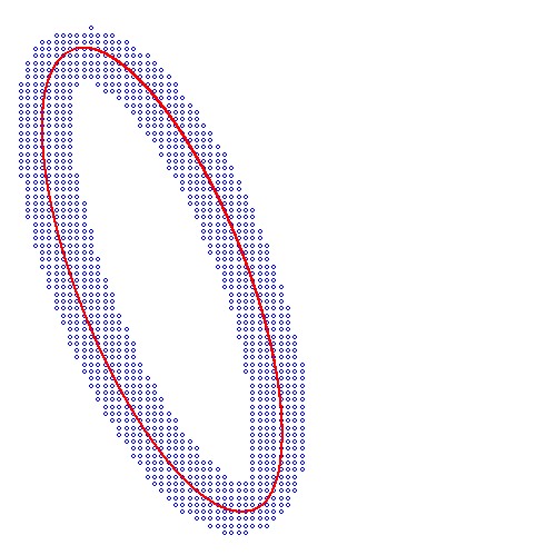 $\,f(x,y)=Ax^2+Bxy+Cy^2+Dx+Ey+F\,$ at level zero: $\,f(x,y)=0\,$. One such result is shown in the picture below. I've been able